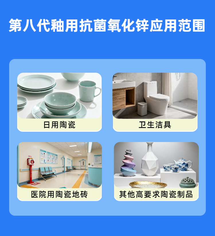 本產(chǎn)品是一款專為日用陶瓷(如餐具、杯盤)和 衛(wèi)生潔具(如馬桶、洗手盆、浴缸、浴室磚)以及公共及醫(yī)療設(shè)施(如醫(yī)院用陶瓷、學(xué)校食堂餐具)等釉面陶瓷制品設(shè)計(jì)的高性能功能性原料。它采用獨(dú)特的鋅基抗菌技術(shù),在提供優(yōu)異抗菌性能的同時(shí),兼具增白與助熔效果,旨在為客戶提供一種安全、高效、經(jīng)濟(jì)且易于應(yīng)用的基礎(chǔ)釉料健康升級(jí)解決方案。